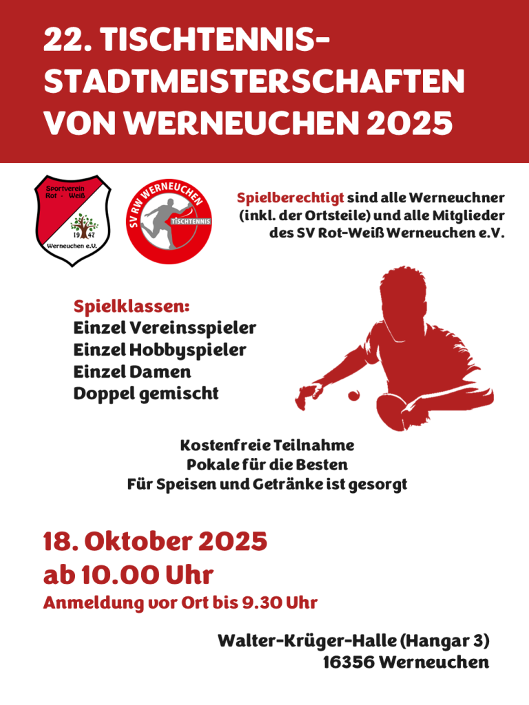Die Abt. Tischtennis lädt am Samstag, den 18. Oktober zur 22. Stadtmeisterschaft in den Hangar 3 ein. In mehreren Klassen werden die neuen Stadtmeister 2025 gesucht. Wir freuen uns auf euch.