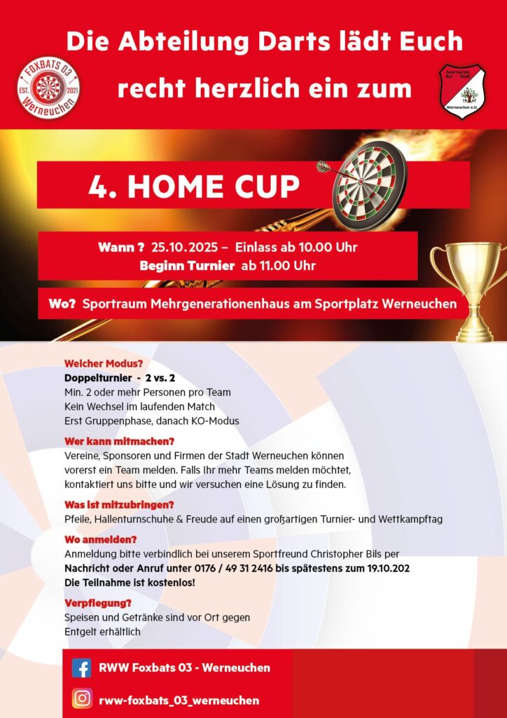 Die Abt. Darts lädt am Samstag, den 25. Oktober zum 4. HOME CUP im Multifunktionsgebäude auf dem Sportplatzgelnde an der Wegendorfer Str. ein. Weitere Infos findet ihr auf dem Flyer.