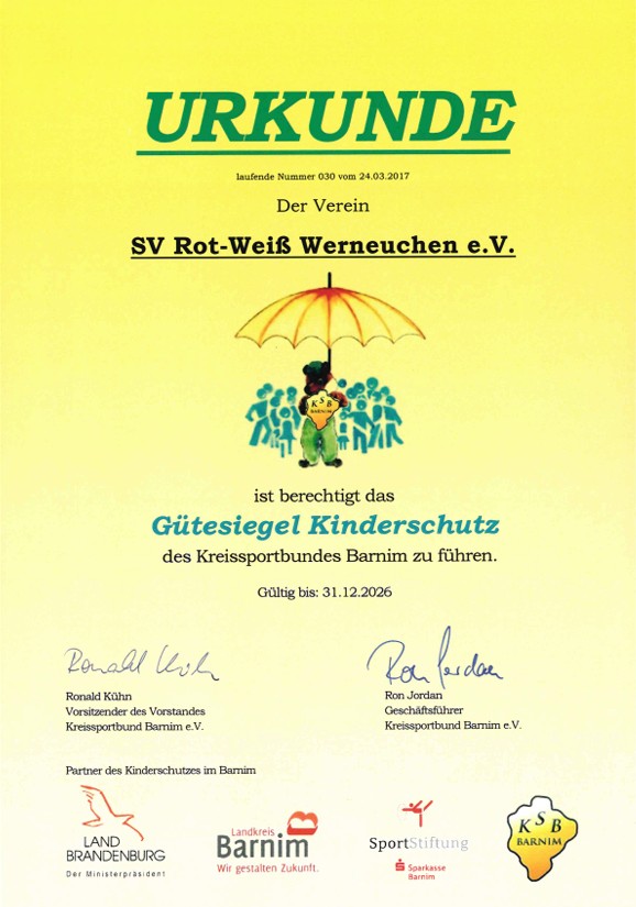 Der SV Rot-Weiß Werneuchen übernimmt Verantwortung für das Wohl der ihm anvertrauten Kinder und Jugendlichen. Seit 2017 ist unser Sportverein im Besitz des Gütesiegel Kinderschutz des Kreissportbundes Barnim.